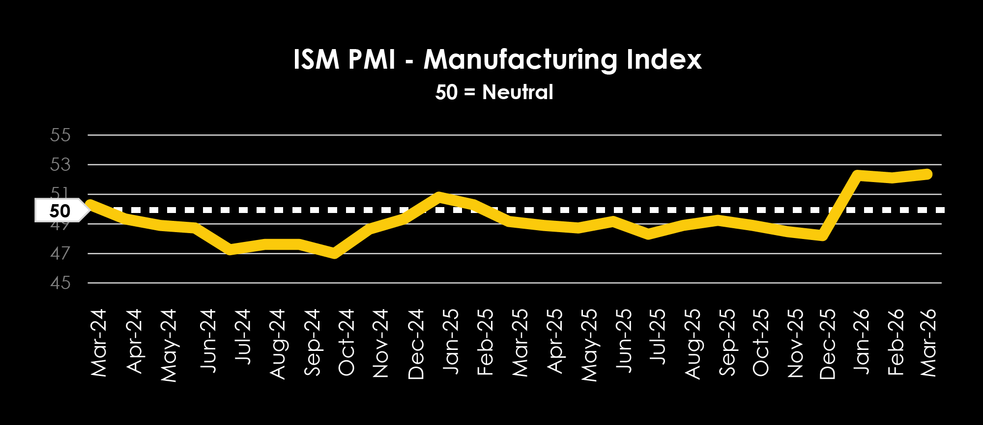 U.S. manufacturing has returned to expansion territory for multiple consecutive months. New orders, production growth, and imports are contributing to increased freight demand, while inventory levels remain relatively lean.