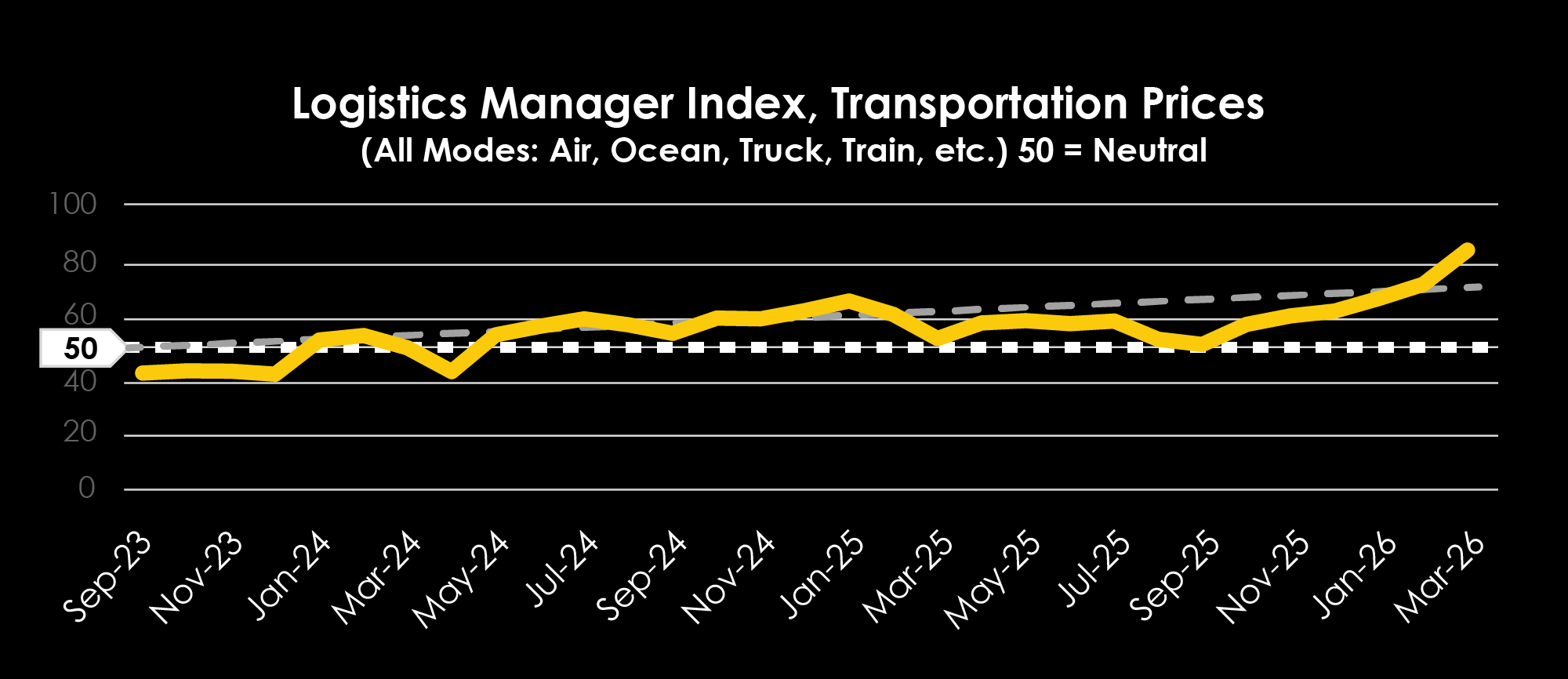 The Transportation Price Index from the Logistics Managers’ Index (LMI) has surged to its highest level since 2022, while the capacity index has dropped below 40. This widening gap reflects a rapidly tightening freight environment, with pricing power shifting back to carriers.